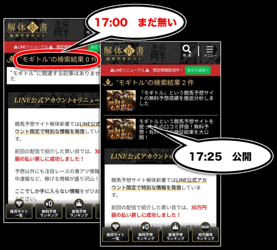 2月18日14時以降、「ビビット」を含む関連サイトと見られる「競馬戦線」や「解体新書」、そのほか複数の外部集客サイトについても、十分おきに何度もリロードを繰り返し、公開状況を確認し続けた。