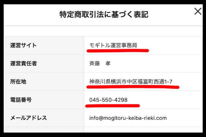 モギトルという競馬予想サイトの運営会社情報について調査したところ、フッターに記載された「特定商取引法に基づく記載」(上画像参照)では、当該サイトは「モギトル運営事務局」名義で競馬予想情報の販売を行っている旨が示されていた。