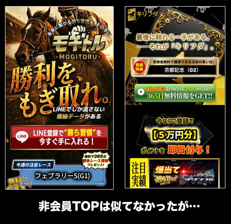 これまで調べてきた情報と、モギトルの会員登録後にも得た情報などを元に考えると、以下の競馬予想サイトがモギトルのグループサイトとして考えられる。