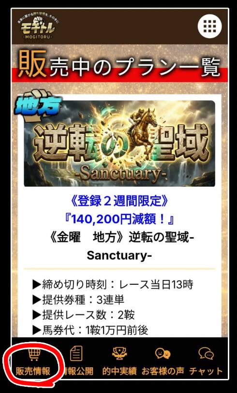 同ボタンを押すと提供中の情報一覧が表示され、その最下部に「無料情報」と記載された項目がある。これがモギトルの無料予想に該当する。