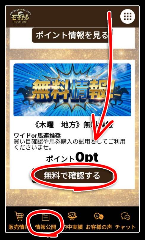 モギトルが提供する無料予想(無料情報)は、会員ページ内のメニュータブにある「情報公開」から確認できる。