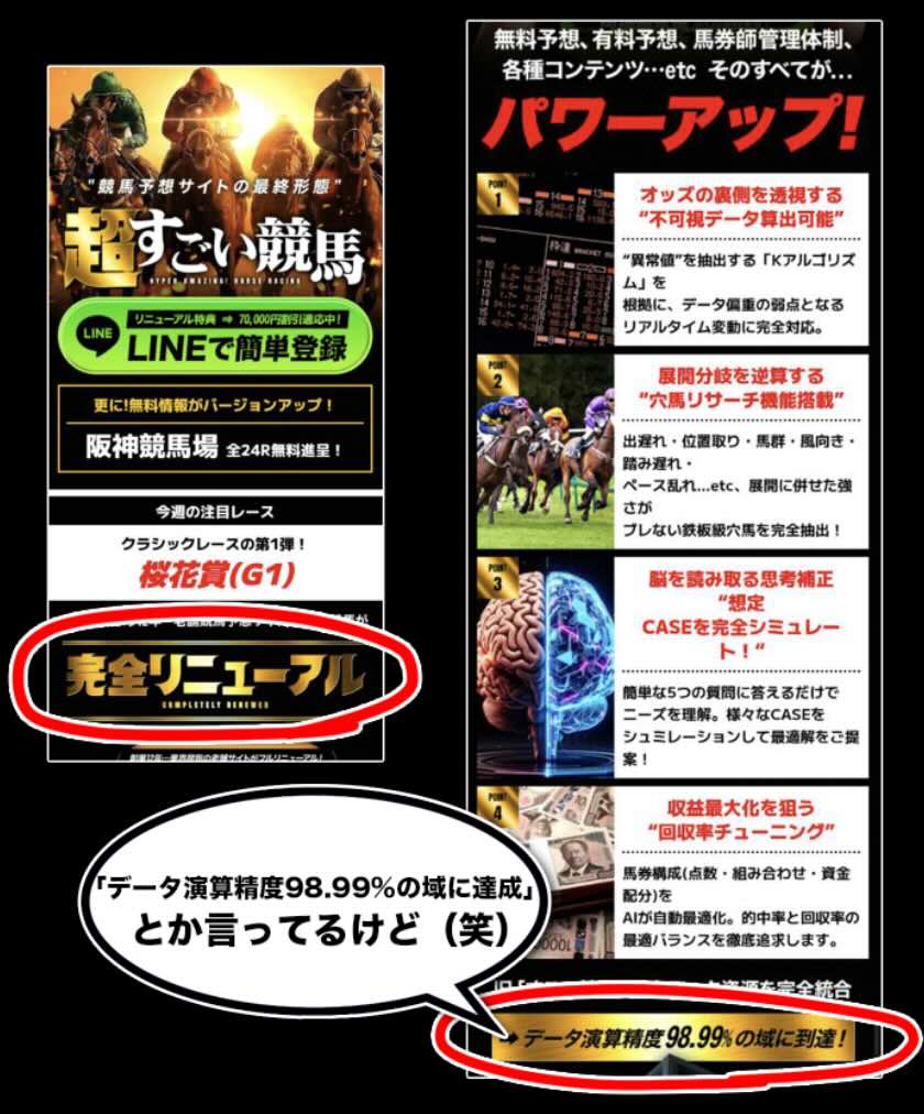今回「超すごい競馬」の非会員TOPページを確認すると、「データ演算精度98.99%の域に到達」といった文言が大きく掲げられている。