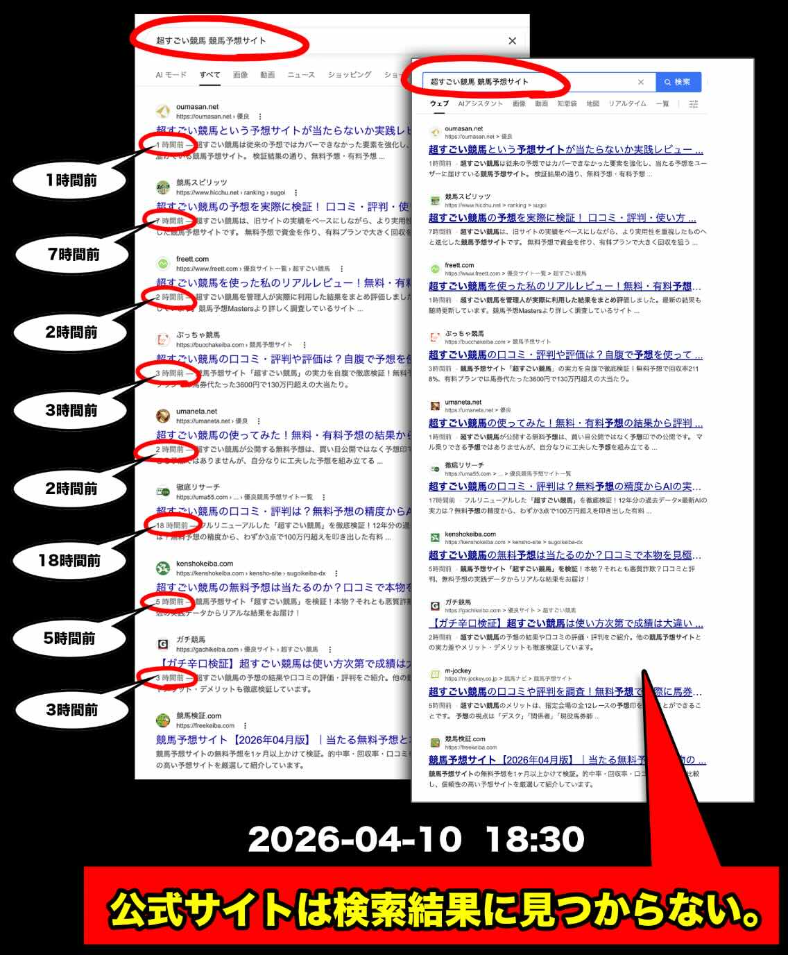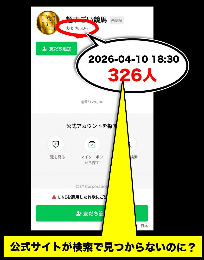 しかし、今回確認された「超すごい競馬」は検索結果を見ても2026年4月10日に発見されたばかりのサイトであり、この時系列にはズレが生じている。