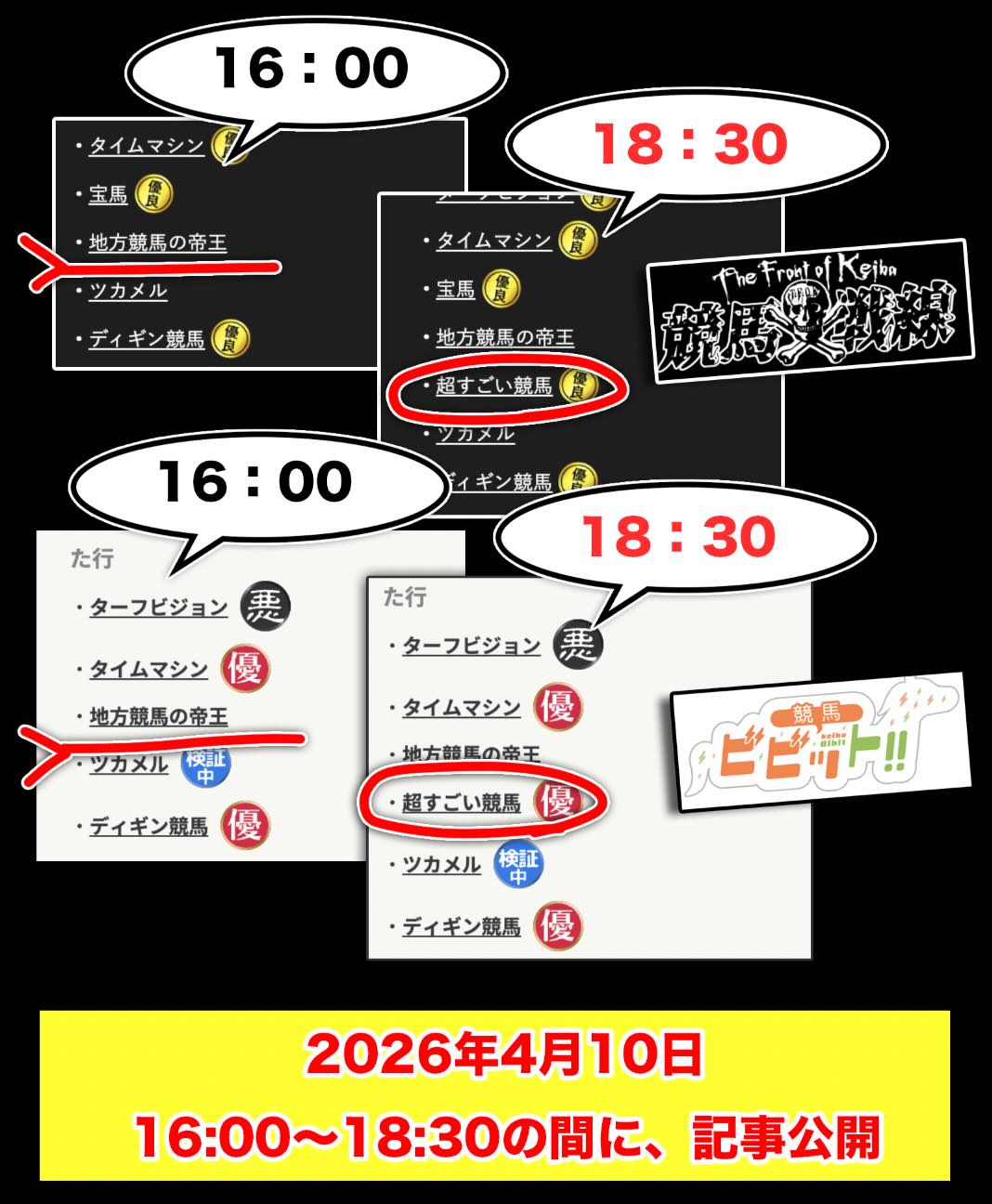 つまり、「競馬戦線」や「ビビット」では、2026年4月10日16時〜18時30分のわずか数時間の間に、「超すごい競馬」に関する情報ページが新規公開された可能性が高い。