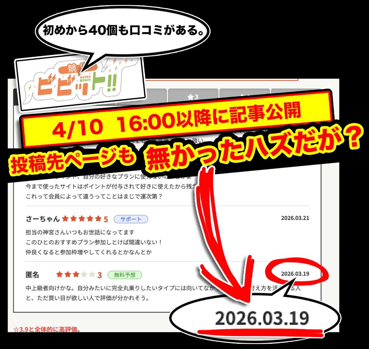 しかし、その後「ビビット」で公開された「超すごい競馬」の記事ページには、公開と同時に「40件」もの口コミが投稿されており、さらに最古の口コミは「2026年3月19日」となっていた。