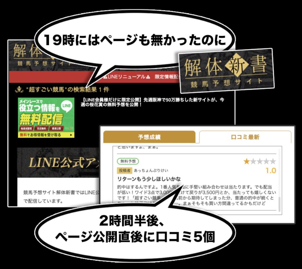公式サイトは検索結果から確認できず、「超すごい競馬」に関する記事も最近公開されたものばかりである状況にもかかわらず、20日以上も前にどのような経路でこのサイトを知り、どこに投稿されたのかは説明がつかない。