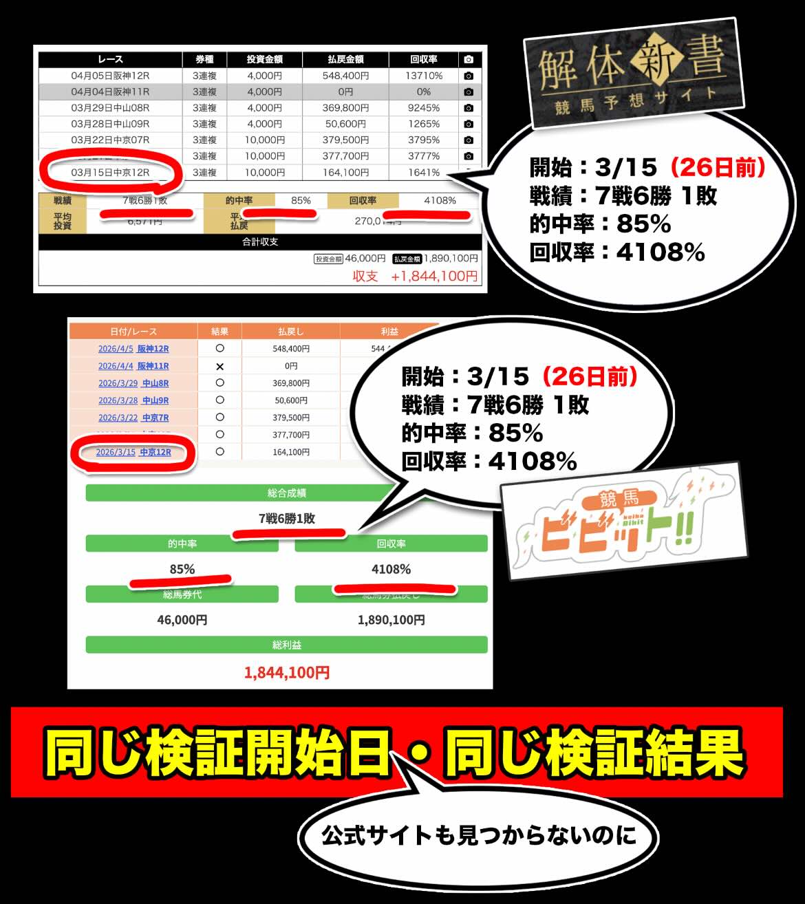 具体的には、7戦6勝1敗、的中率85%、回収率4108%という数値が、いずれのサイトでも同一の内容として掲載されていた。