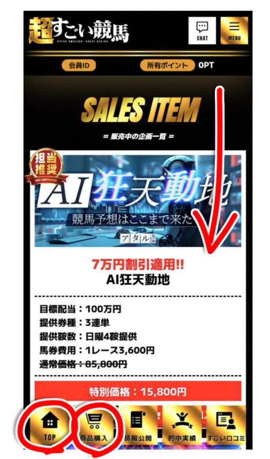 「超すごい競馬」が提供する有料予想について確認すると、販売ページはTOPページを下部までスクロールするか、メニュータブの「商品購入」からアクセスできる構成となっている。