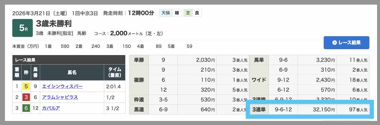 的中した中山1Rでは111.3倍の3連単と、18.7倍の3連複、それと11.3倍の馬連と、3券種とも全てが的中した。