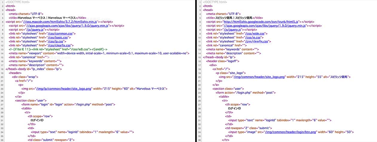 スピリッツ競馬(SPIRITS)と、マーベラスのレイアウトが似ているということが確認できたので、次にこの2サイトのページソースを見比べてみると、ページソースもほぼ同じだ。