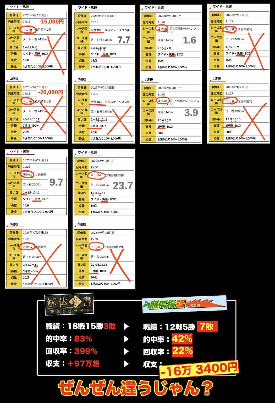 集客サイトによる戦績では、的中率75%、回収率250%だったが、競馬検証.comが全く同じ条件で検証したところ、12戦1勝11敗、的中率8%、回収率17%、収支は−12万1880円となった。ぜんぜん違う結果じゃないか。