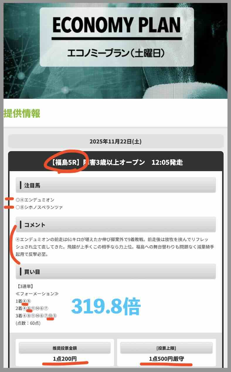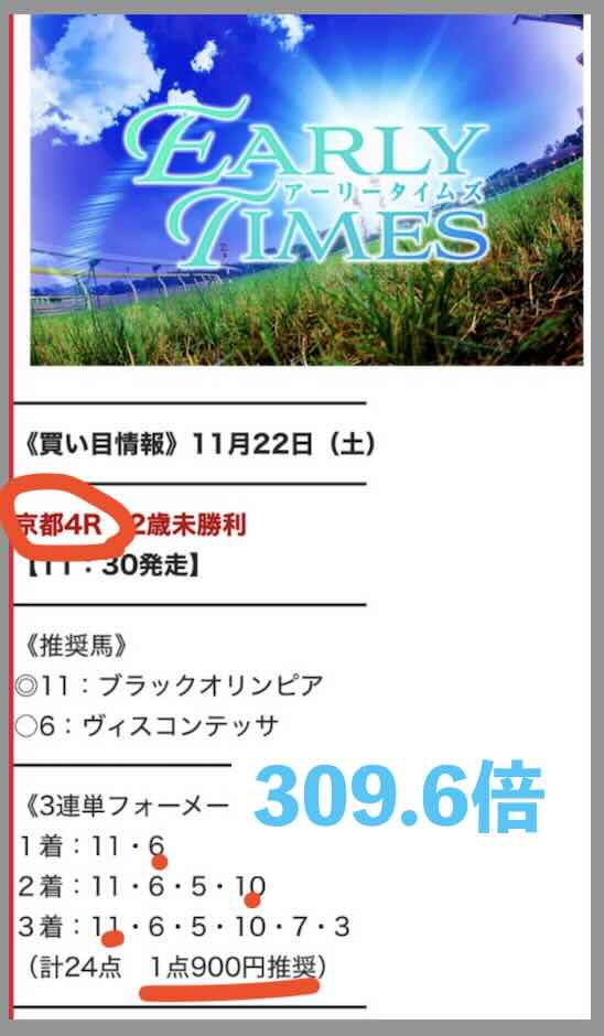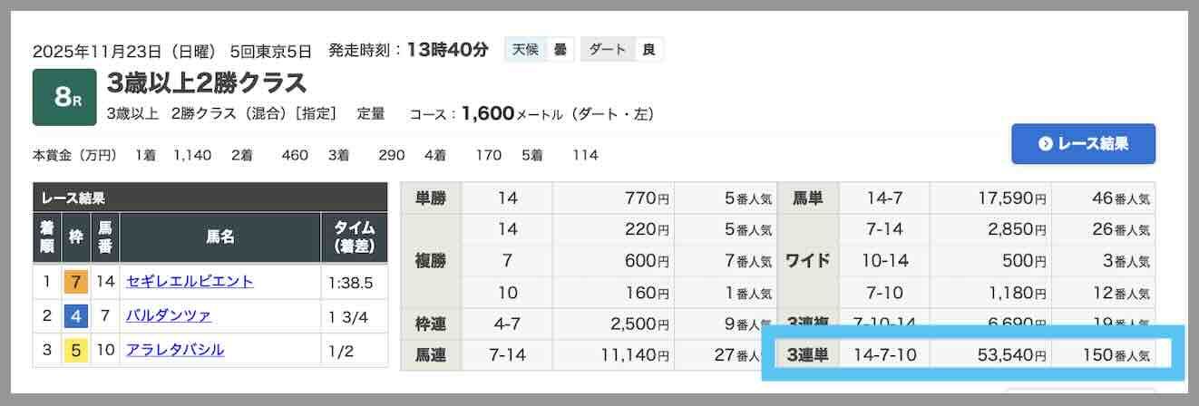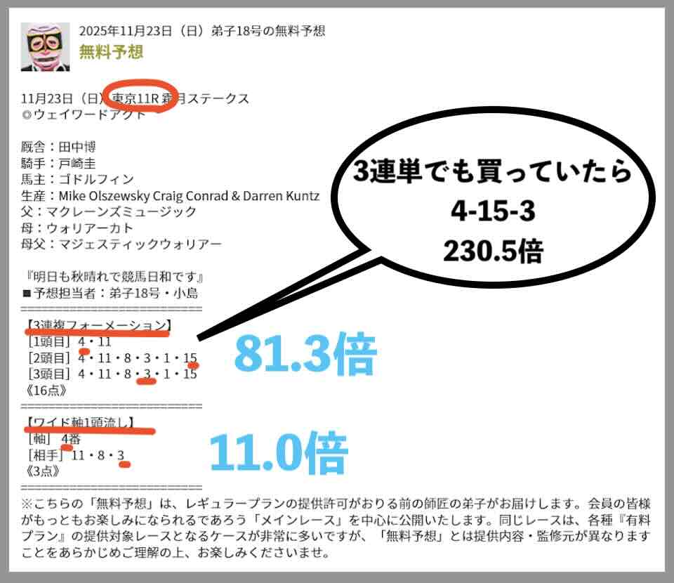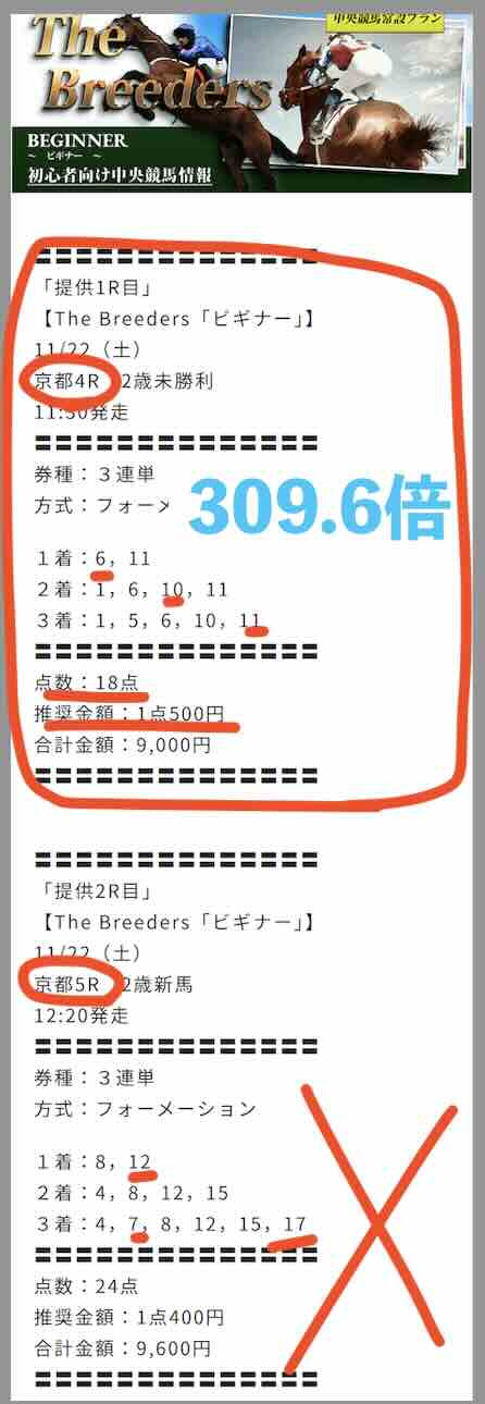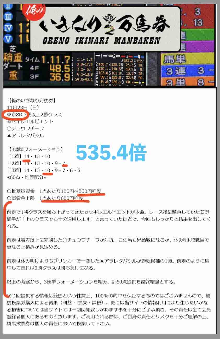 11/23には、またしても低額コース(180pt)の「いきなり万馬券」にて、東京8Rにて535.4倍の万馬券を的中。