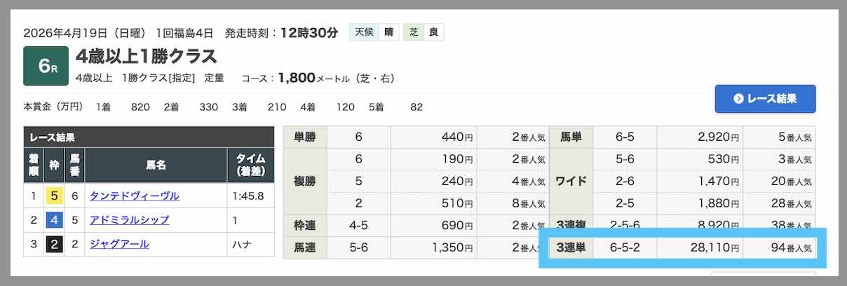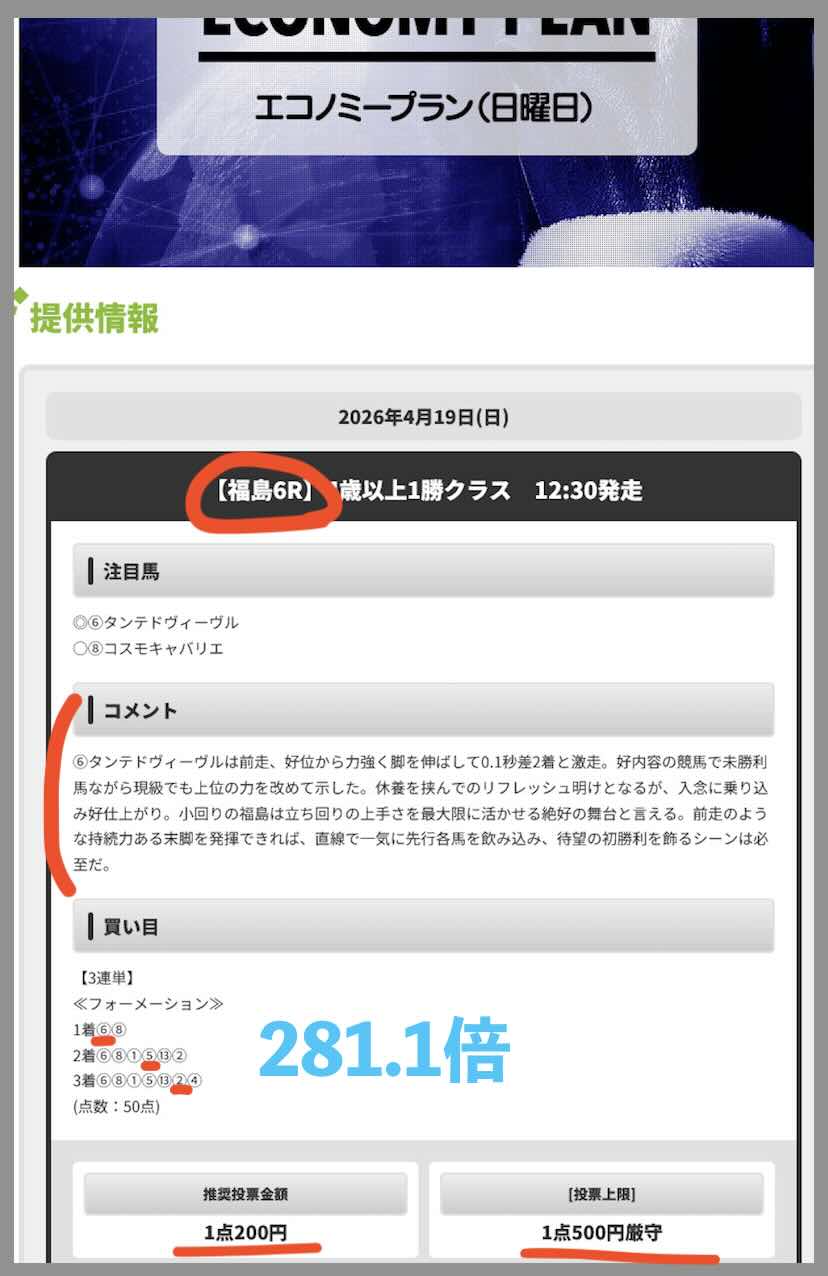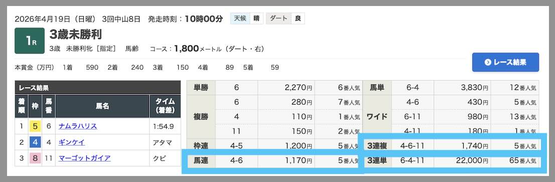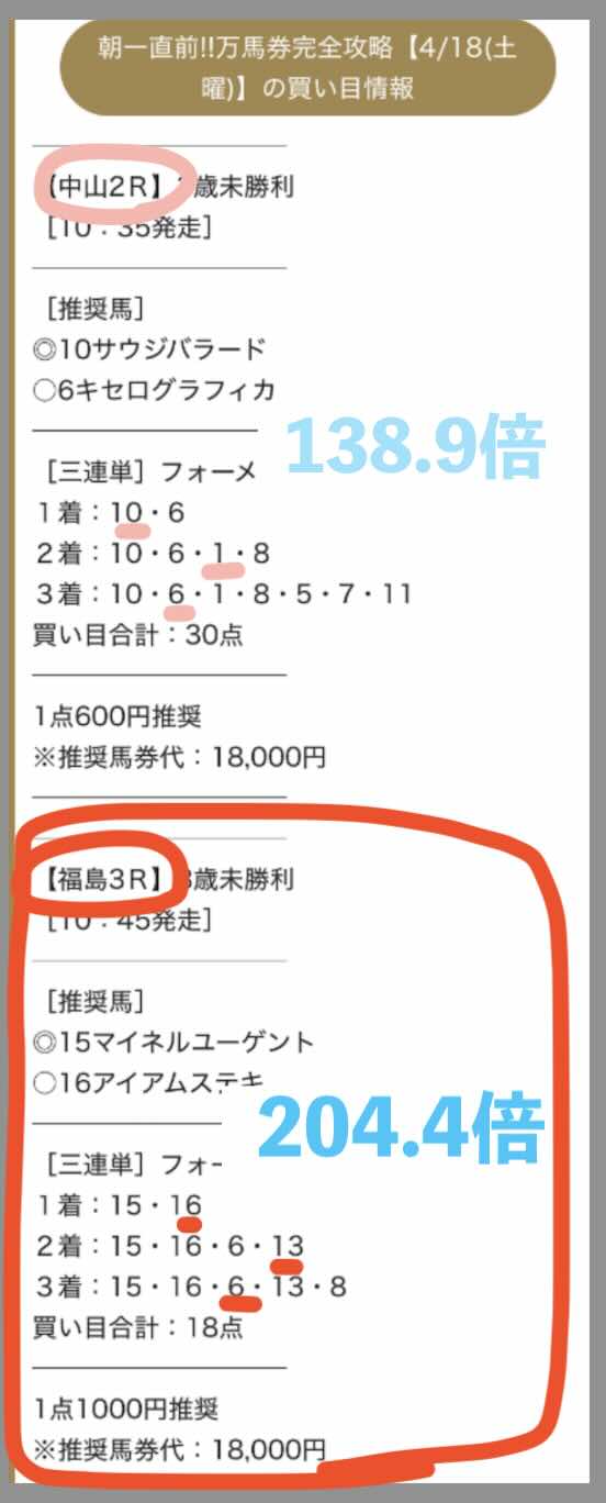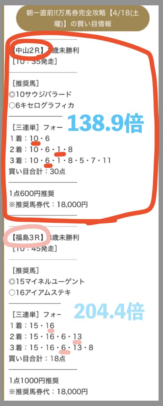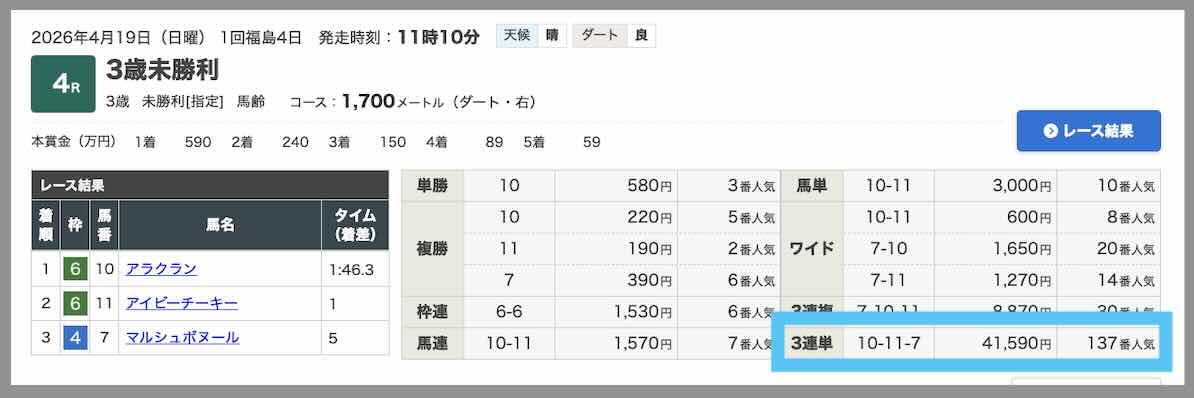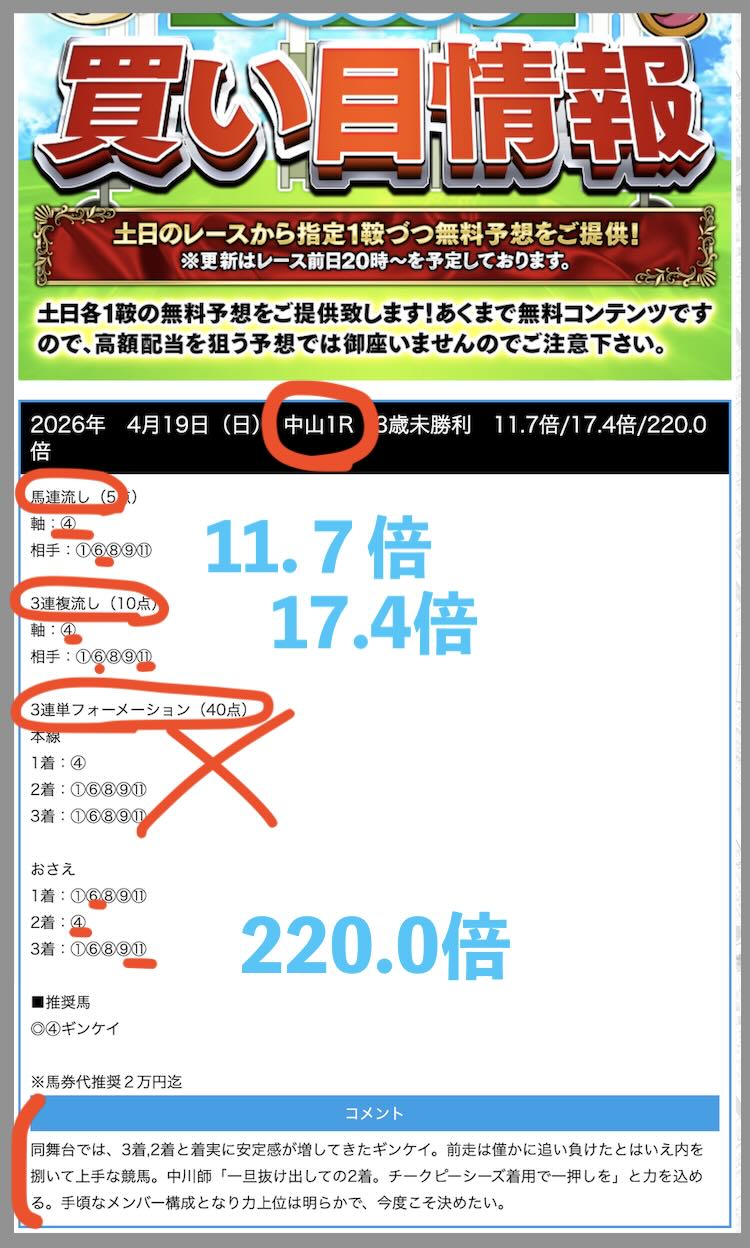 無料予想の回収率が高いことで注目されていたレープロだが、 4/19にも無料予想で、中山1Rにて、220.0倍、17.4倍、11.7倍の3券種全て的中で、推奨通りに買っていたら19万 1600円になっていた。基本、レープロが無料予想で的中する時は全3券種的中となることが多い。