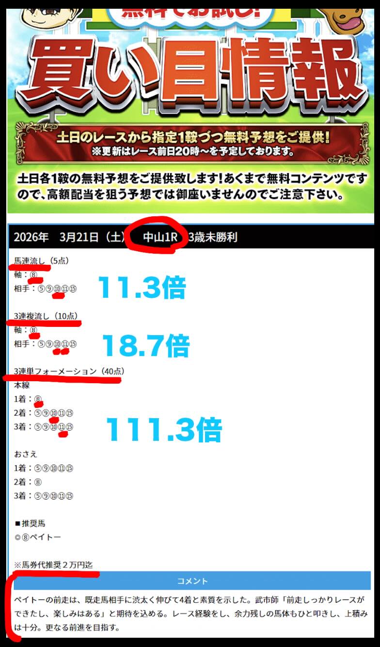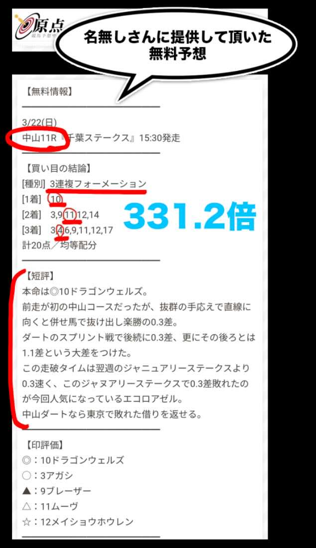 下記競馬予想サイトの提供している無料情報(無料予想)に対し、抜き打ちで、買い目の検証とレース回顧をしました。