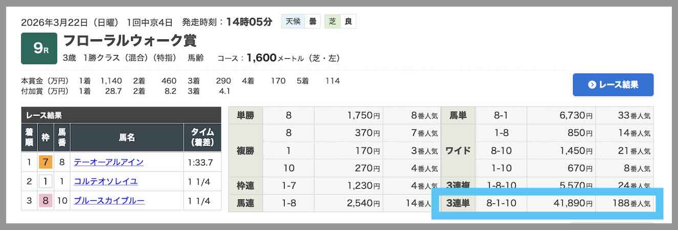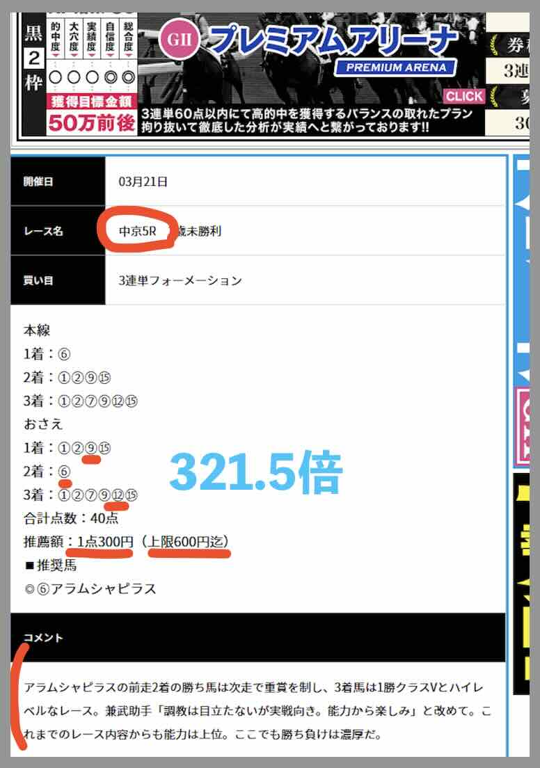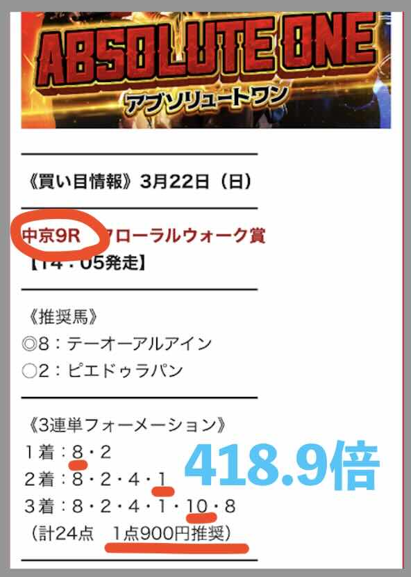 3/15にもなんと、わずか20pt予想(2000円)で参加できる超・安価な予想コースで、中京10Rにて、3券種中3連単で478.1倍の的中。仮に500円で全券種を買ってたら、今回は2000円予想で、23万 9050円の払戻しになった計算だ。