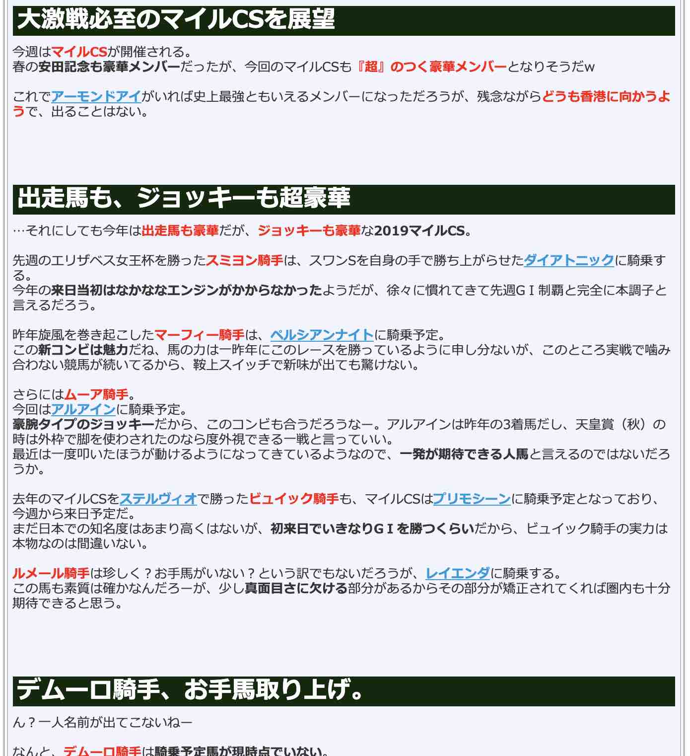 2019マイルCSの出走馬も、ジョッキーも超豪華なんだけど、1人、デムーロ騎手は騎乗予定馬が現時点でいない。