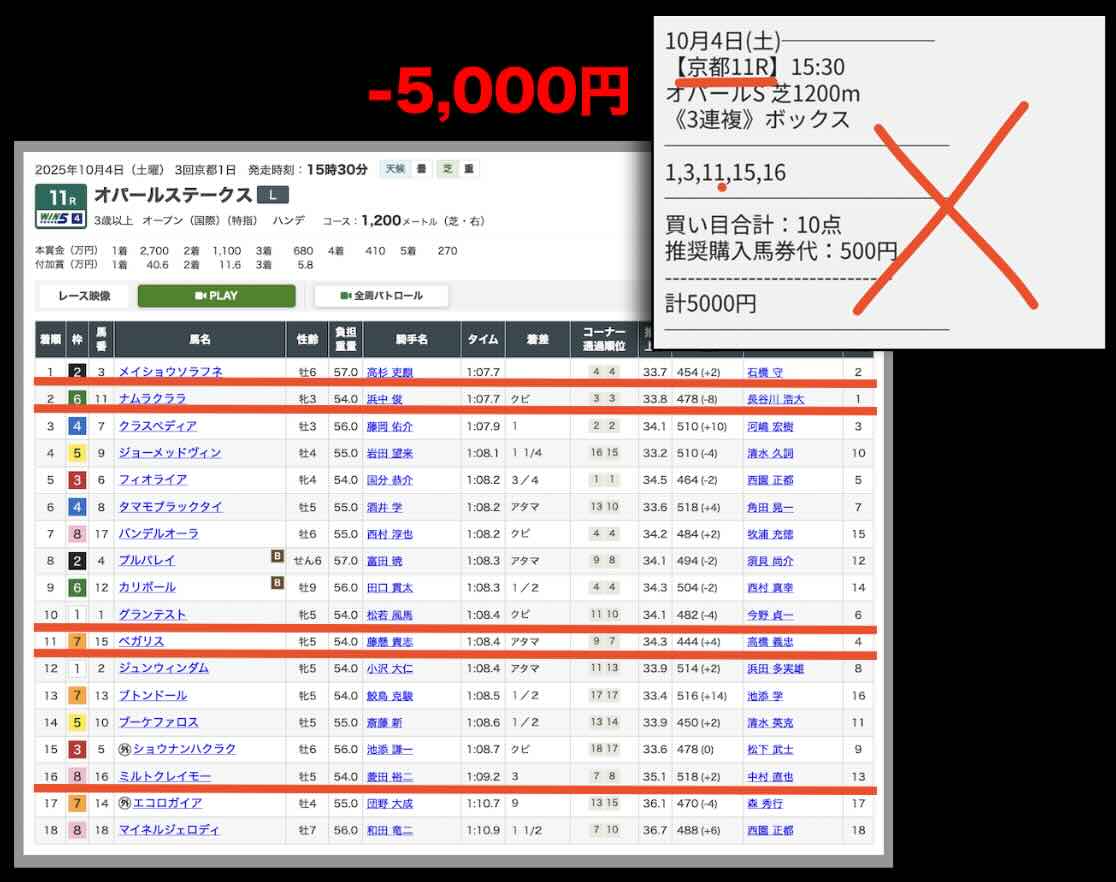 穴馬党の今回抜き打ちで検証する無料予想(無料情報)は、2025年10月4日の京都11Rで提供された買い目である。