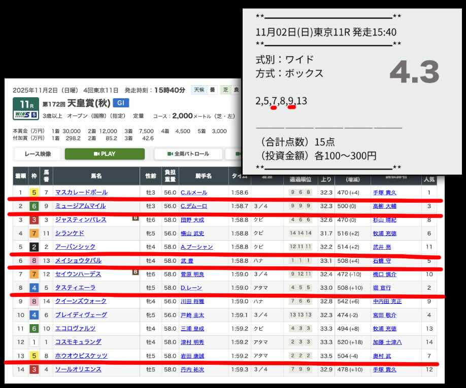 「テキカク」の無料予想(無料情報)だが、今回抜き打ちで検証するのは、2025年11月2日の東京11Rで提供された買い目である