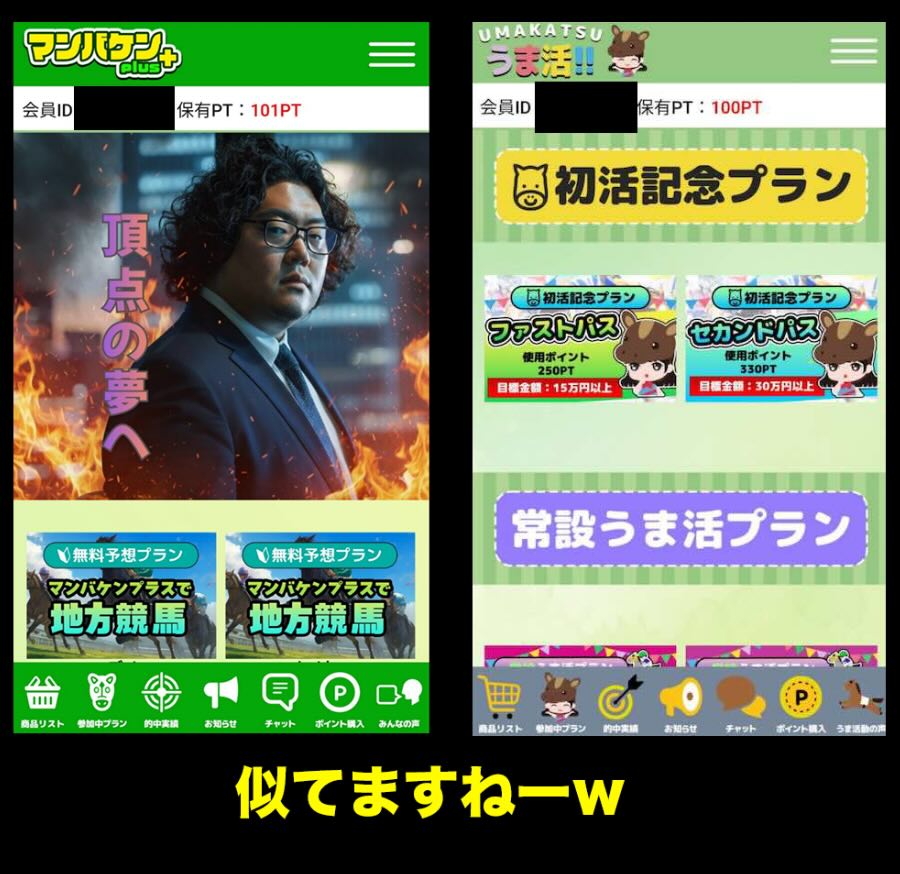 さらに、会員ページのデザインや構成を比較すると、既存の競馬予想サイト「うま活」と類似点が多く、IPアドレスにも近似が見られた。