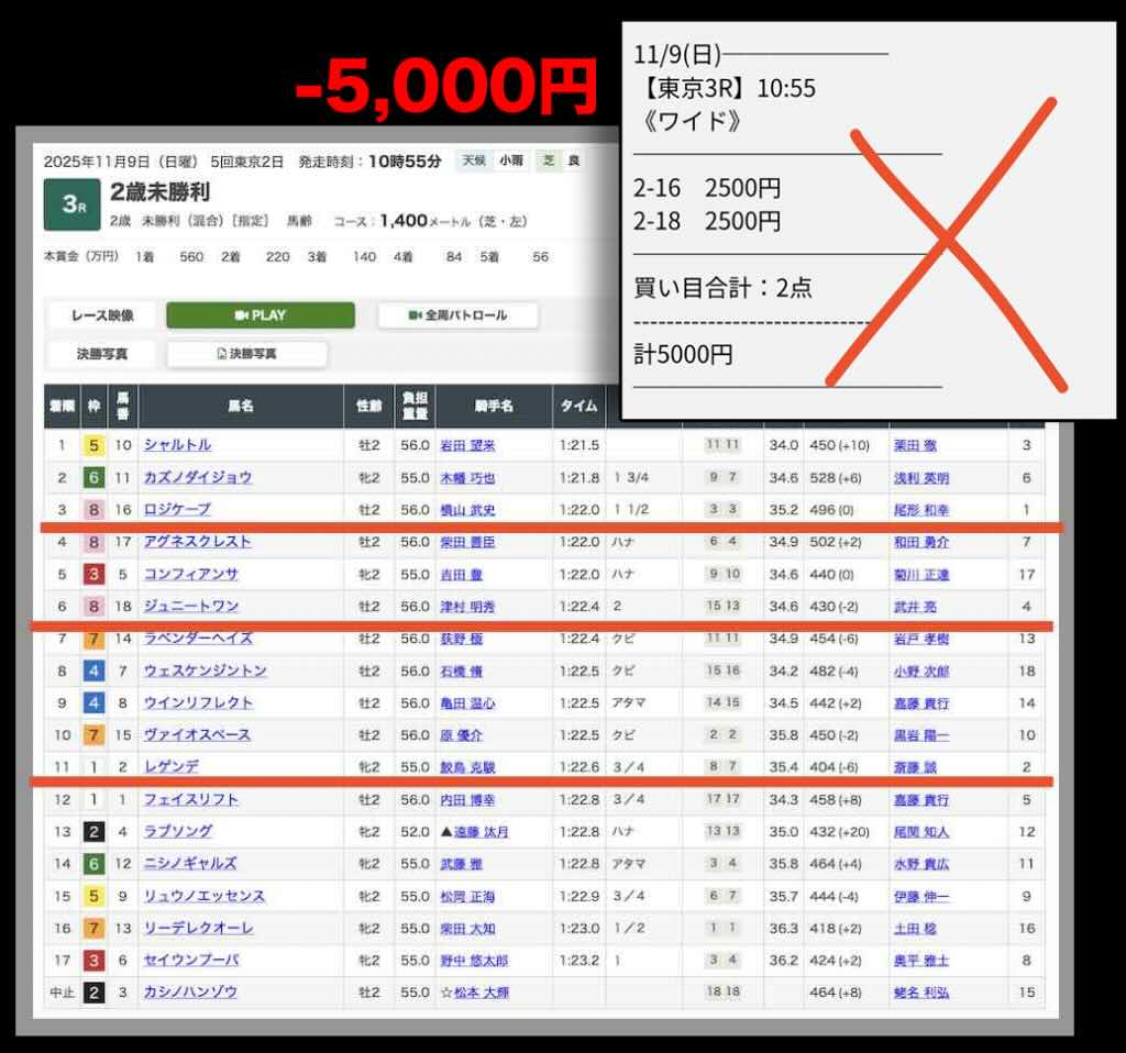 今回抜き打ちで検証する「ディギン競馬」の無料予想(無料情報)は、2025年11月9日の東京3Rで提供された買い目である。