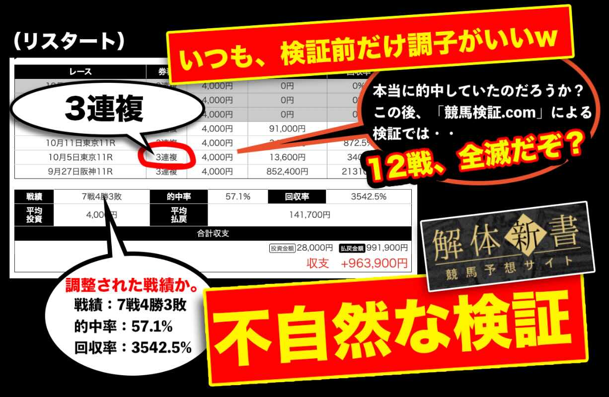 今回のリスタートの無料予想においても、外部集客サイトに記載されている成績とは対照的な実測値となり、内容の正確性については慎重に検証する必要があると判断した。