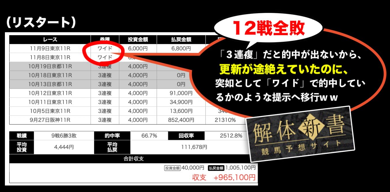 もう一つ、外部集客サイトによるリスタートの戦績で注目したいのは、競馬検証.comが検証を始める前には的中実績の更新が見られたものの、実際の検証で12連敗が続いたあと、成績の更新が途絶えていた点である。その後、これまで「3連複」で示されていた実績が、突如として「ワイド」の検証に変わり、的中しているように見える形で紹介され始めたことも確認できた。