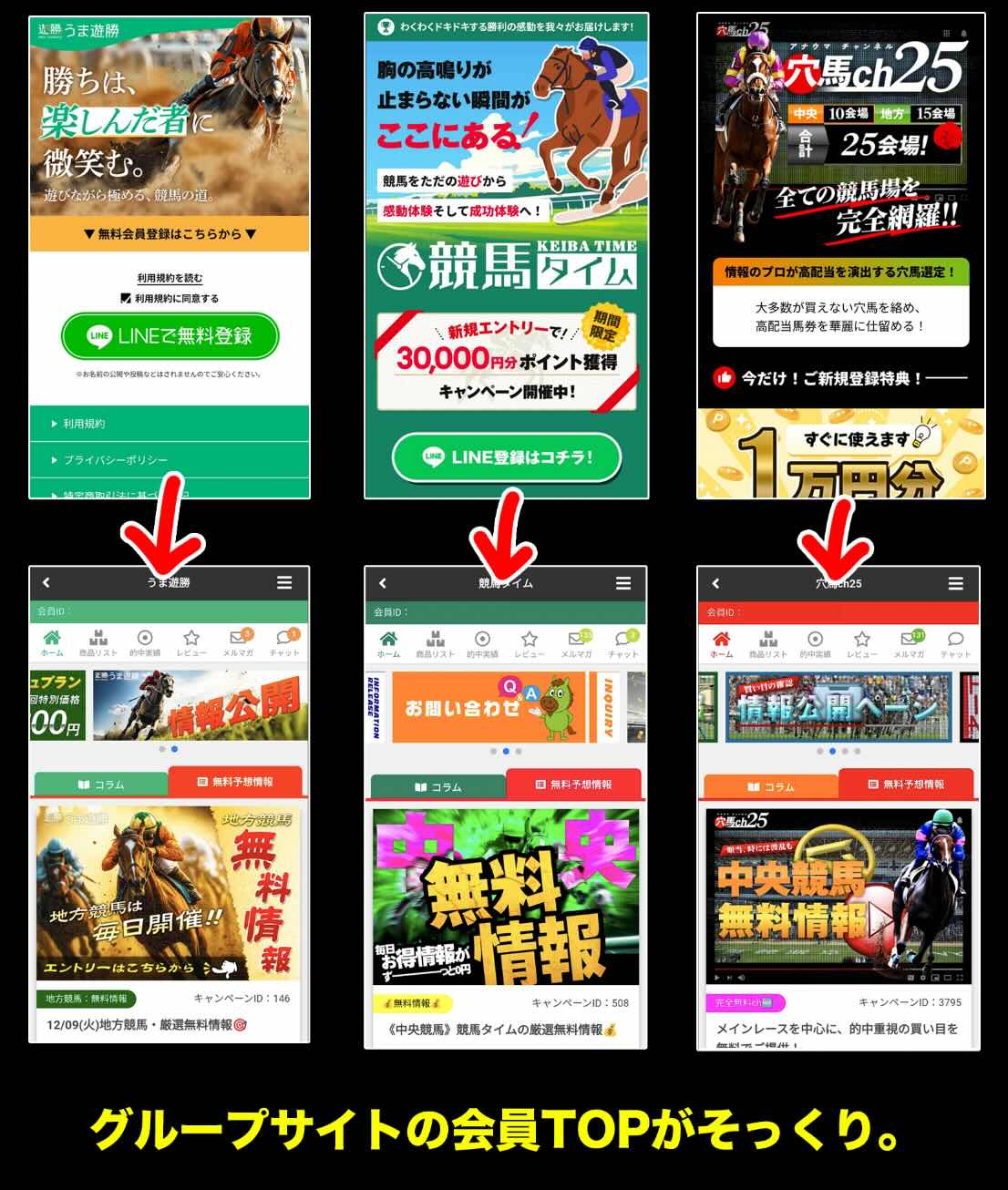 また、「うま遊勝」の運営社とされる「株式会社アーチ」についても、会員登録後のページ構造を別名義の「競馬タイム」や「穴馬ch25」と比較すると、画面設計や配置が驚くほど似通っている。