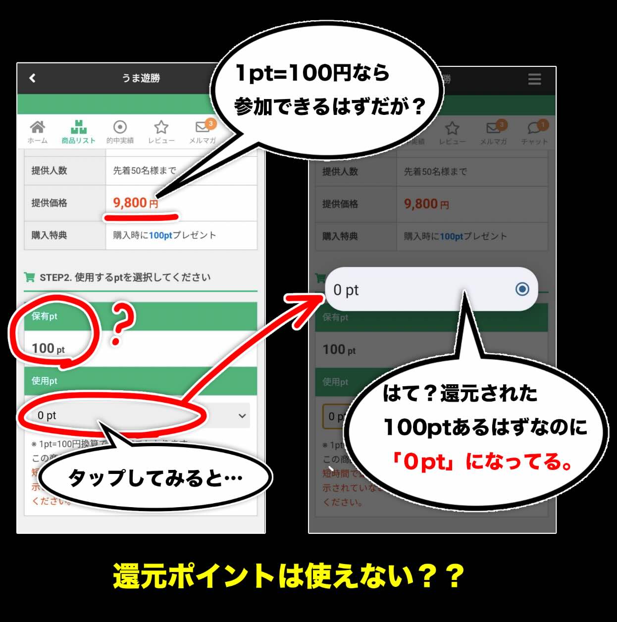 加えて、「うま遊勝」では登録時にポイント還元があるように見えるものの、会員ページをくまなく探しても付与されたポイントを使用できる箇所が見当たらなかった。ポイントが機能していないのであれば、その存在理由自体に疑問が残る。