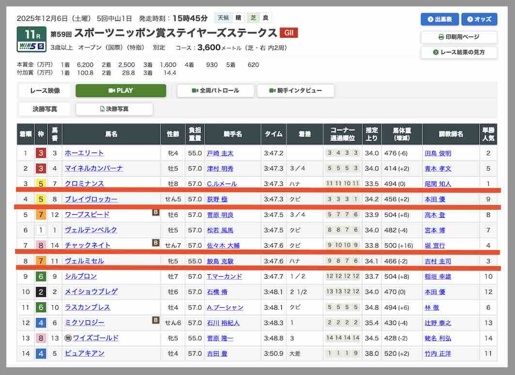 今回抜き打ち検証するリスタートの無料予想(無料情報)は、2025年12月6日の中山11Rで提供された買い目である。