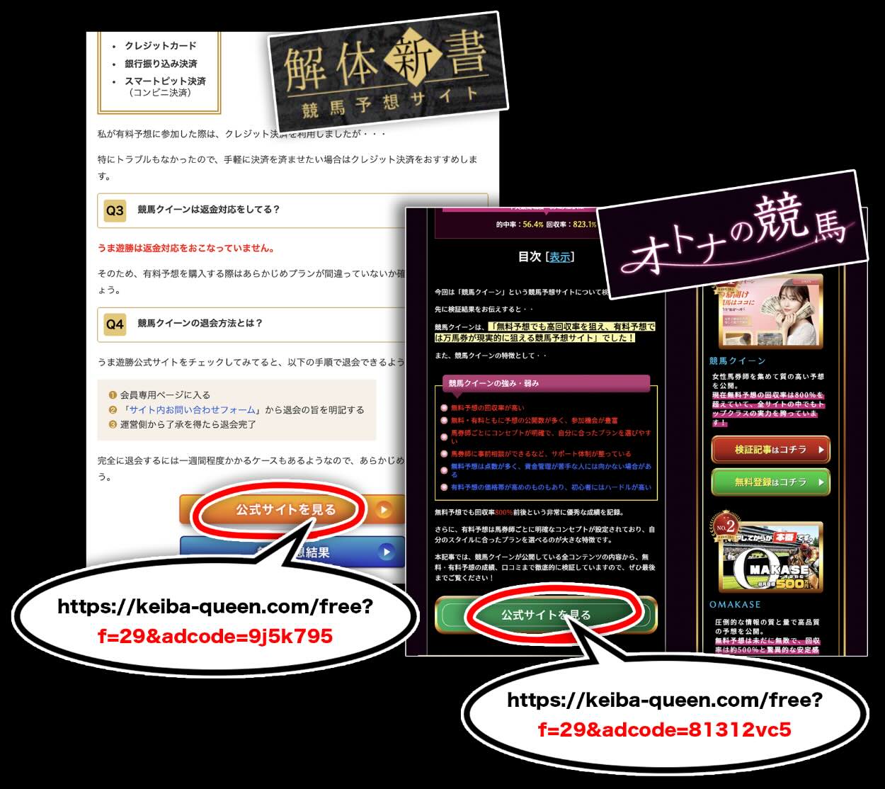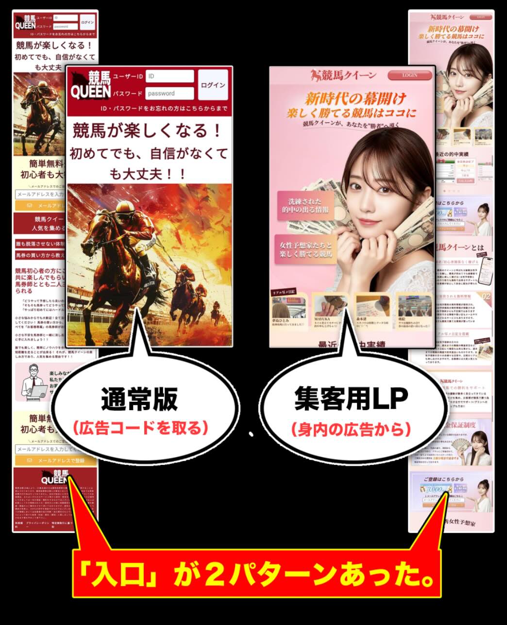 今回取り上げた「競馬クイーン」という競馬予想サイトは、表面上のサービス内容だけを確認しても、外部集客サイトからのみアクセスできる「集客用LP」のページと、通常アクセス時に表示される「通常版」ページが併存しており、全体像を把握しづらい競馬予想サイトの一例と言える。