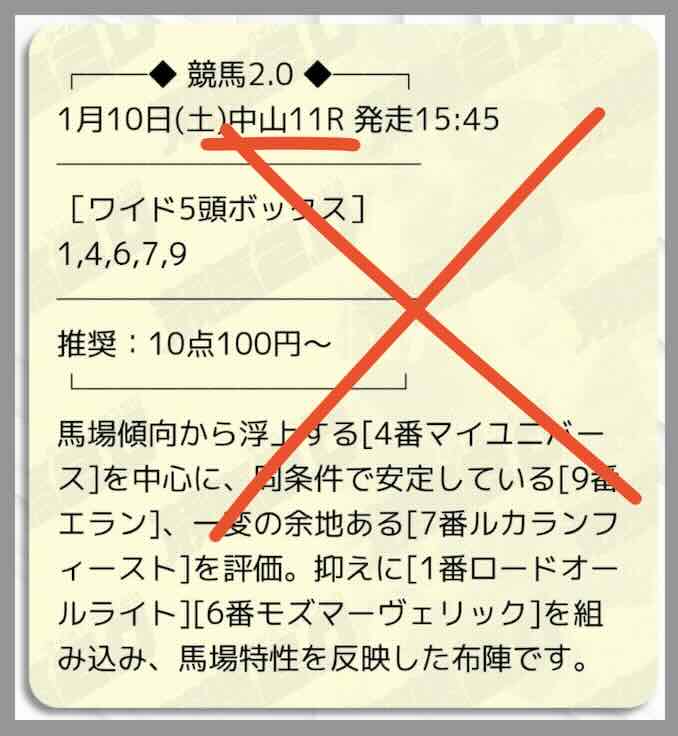 今回抜き打ちで検証する競馬2.0の無料予想(無料情報)は、2026年1月10日の中山11Rで提供された買い目である。