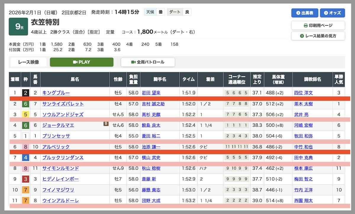 今回抜き打ちで検証する「本命」の無料予想(無料情報)は、2026年2月1日の京都9Rで提供された買い目である。