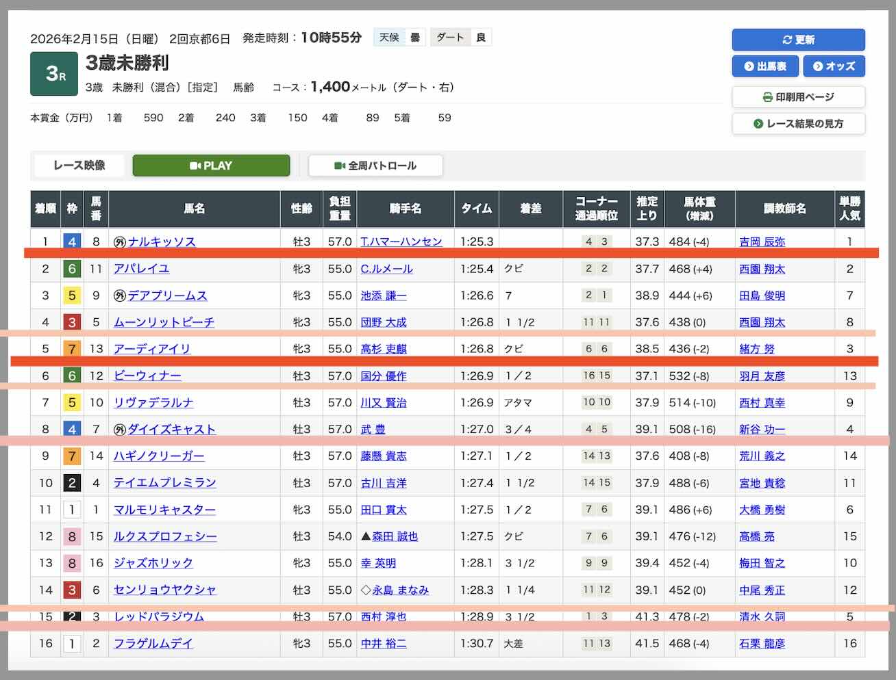 今回抜き打ちで検証した競馬クイーンの無料予想(無料情報)は、2026年2月15日の京都3Rで提供された買い目である。