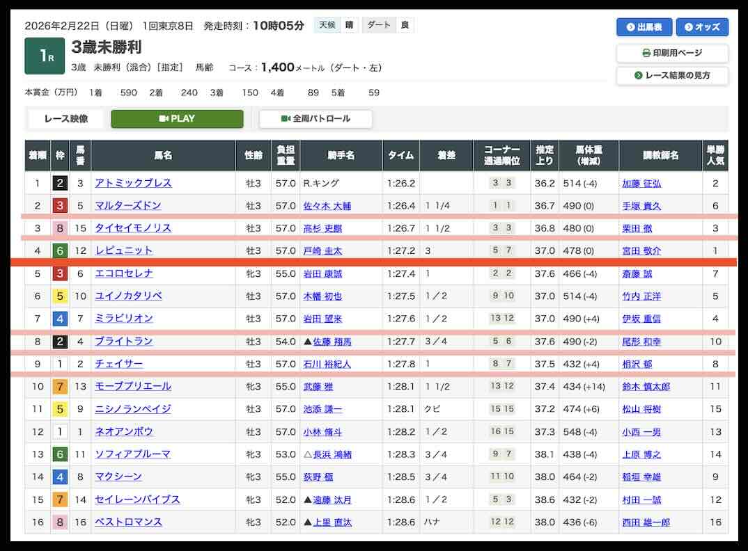 今回抜き打ちで検証するウマドラの無料予想(無料情報)は、2026年2月22日の東京1Rで提供された買い目である。