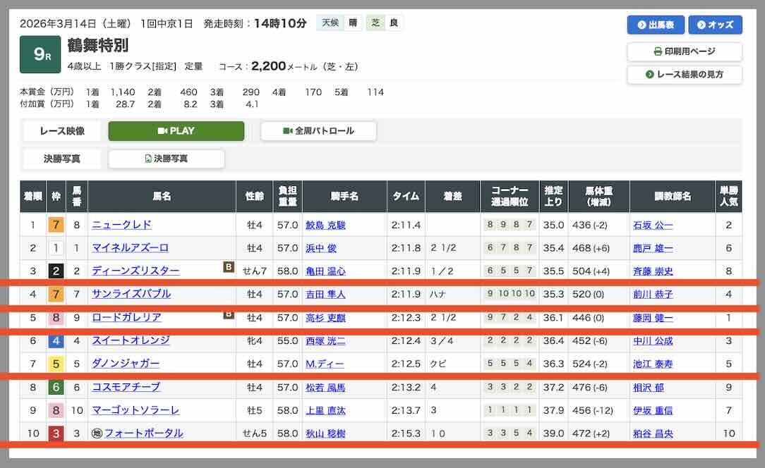 肝心の1着8番ニュークレド(2人気)と2着1番マイネルアズーロ(6人気)は買い目に含まれておらず、馬連・ワイドともに成立しない結果となった。