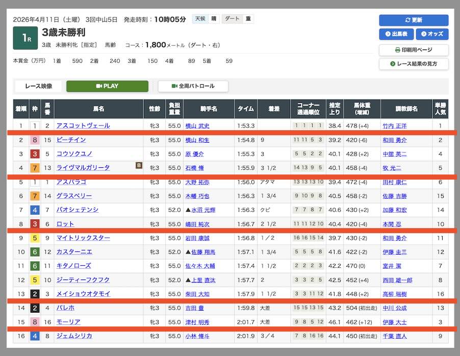 今回抜き打ちで検証する競馬レッドライナーの無料予想(無料情報)は、2026年4月11日の中山1Rで提供された買い目である。