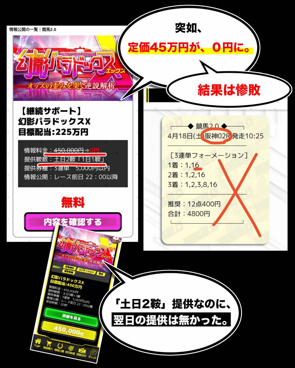 今回抜き打ちで検証する競馬2.0の無料予想(無料情報)は、本来であれば「定価45万円」とされる「幻影パラドックス」が、なぜか45万円値引きの0円で提供されていた点に着目し、その中で提示された2026年4月18日の阪神2Rの買い目を検証対象としたものである。