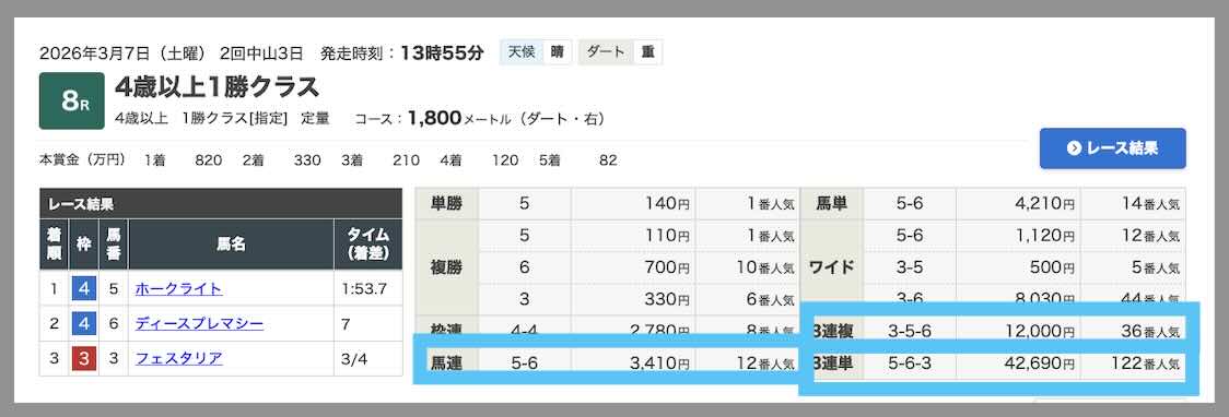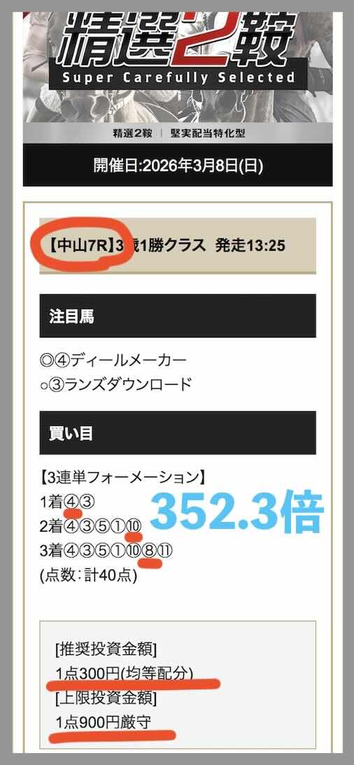3/8は「精選2鞍」というコース(180pt)で中山7Rにて352.3倍の的中となり、推奨金額で馬券購入した場合、600円が31万 7070円の獲得となった。