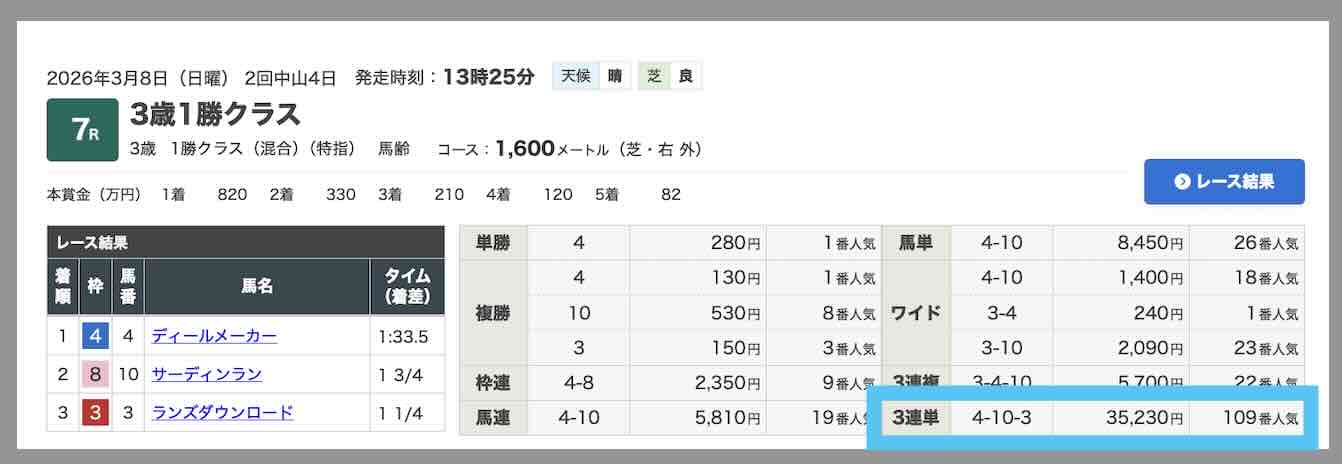 3/1に提供された「エコノミープラン」というプランで、中山1Rにて268.3倍の的中。1点あたり最大の700円で購入していたら18万 7810円の獲得となった。